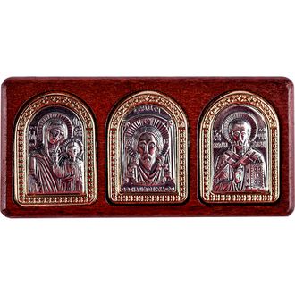 Икона автомобильная, триптих, мельхиор, золочение, серебрение, дерево, на двухстороннем скотче (№27)