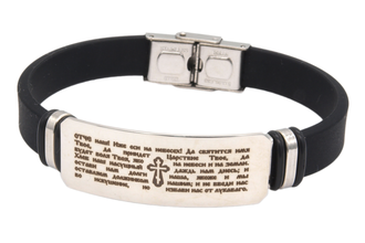 Браслет силиконовый, с гравировкой "Отче наш…", чёрный. Размер регулируется (10-20 см). Материалы: силикон и нержавеющая сталь. Можно мыть руки и принимать душ.