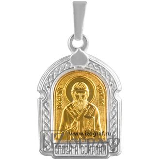 Именная нательная икона Святой Равноапостольный Кирилл, Учитель Словенский. Икона изготовлена из мельхиора и покрыта чистым серебром (12 мкм) и золотом (0,5 мкм).