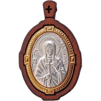 Именная нательная икона Святая Мученица Алевтина (Валентина) Кесарийская. Иконка (образок) сделана из благородного и твердого дерева - груши, пропитана маслом и церковными благовониями по нашему оригинальному рецепту. Металлическая вставка изготовлена из мельхиора и покрыта серебром с чернением.